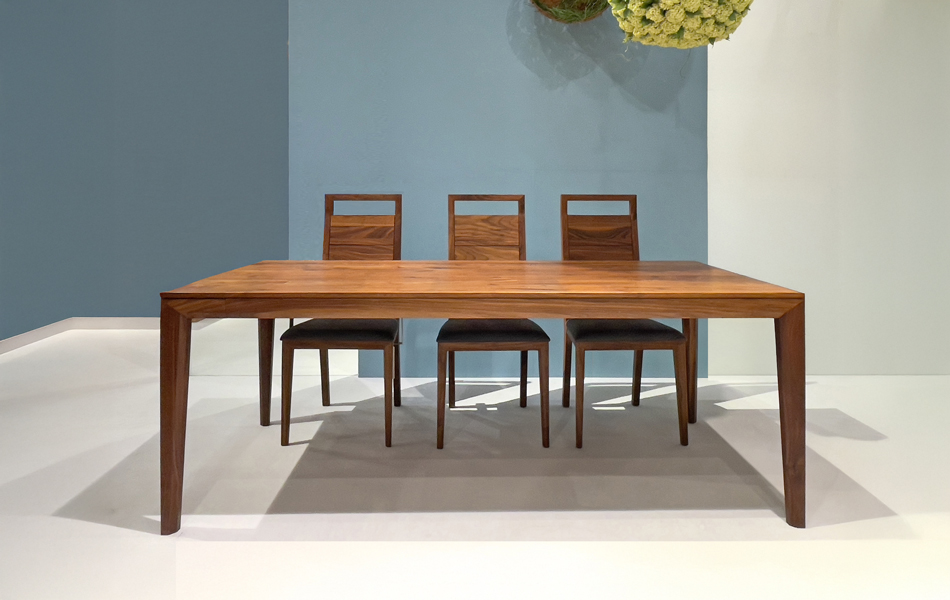 Esstisch ARTUS, 4 angeschnittene Stollen, Platte durchgehend, Ausziehstollen mit Rollen, Auszug mit einhändiger Bedienung